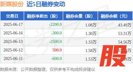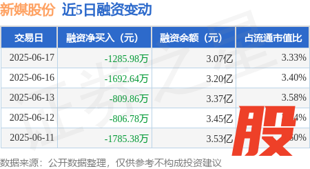 本站消息老钱庄,6月17日,新媒股份(300770)融资买入2165.35万元,融资偿还3451.33万元,融资净卖出1285.98万元,融资余额3.07亿元。