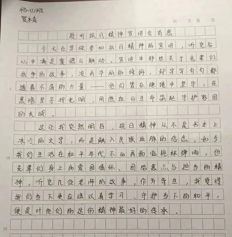 我有幸现场聆听了抗战精神宣讲员的分享。那些曾沉淀在历史长河里的片段,经宣讲员饱含深情的讲述,仿佛褪去了时光的尘埃,变得鲜活立体、直击人心——有好几次,我都清晰地感受到眼眶发热,滚烫的情绪在心底翻涌,久久无法平静。于我而言,不仅是一次深刻的精神洗礼,更是一场关于“如何以教育者身份传承红色基因”的思考启蒙。作为班主任,我们不仅要让学生“知道”历史,更要让他们“读懂”历史背后的精神力量。我们是红色故事的“传递者”,更是精神传承的“引路人”,要引导学生成长为有家国情怀、有责任担当的时代新人。